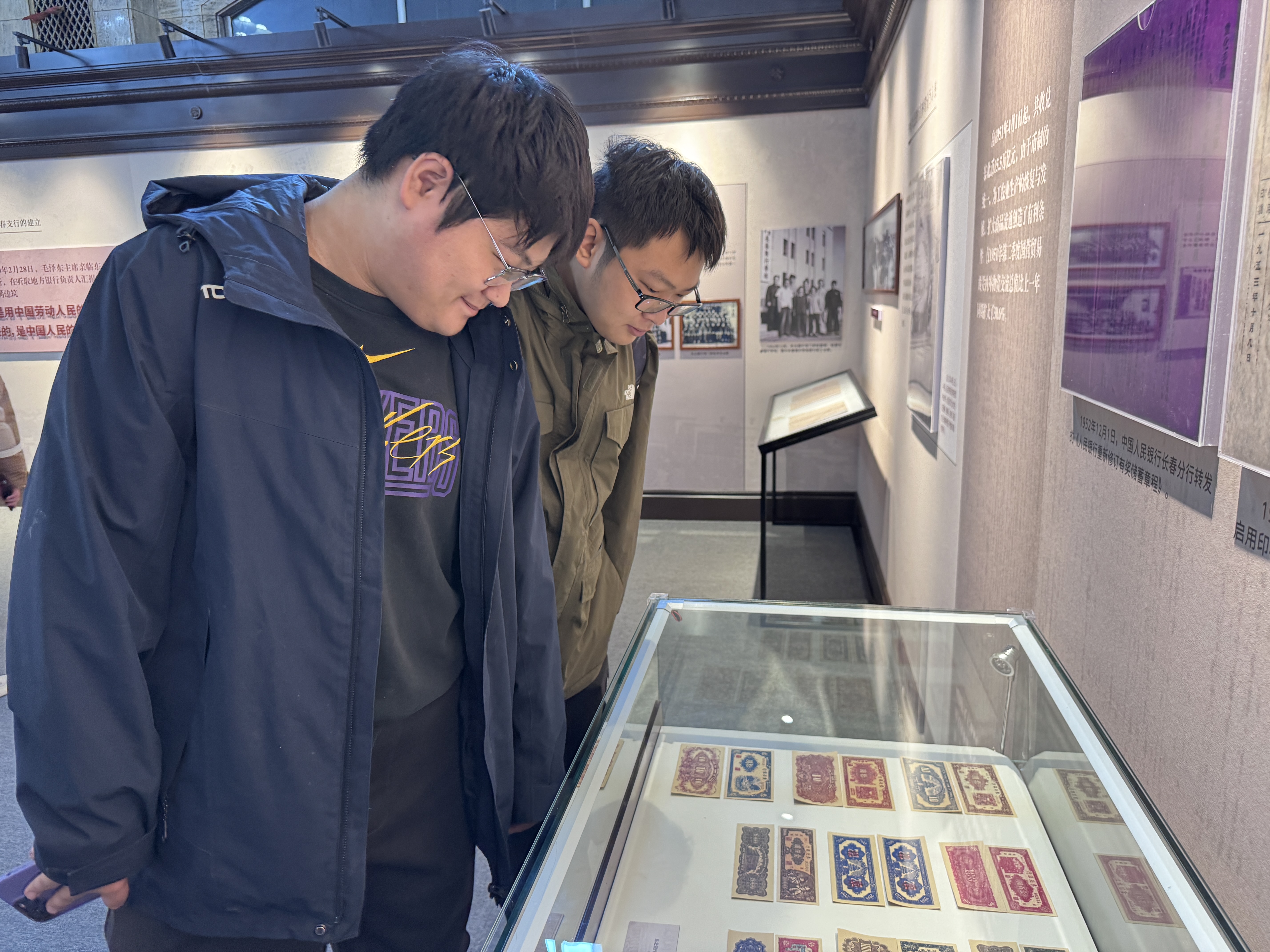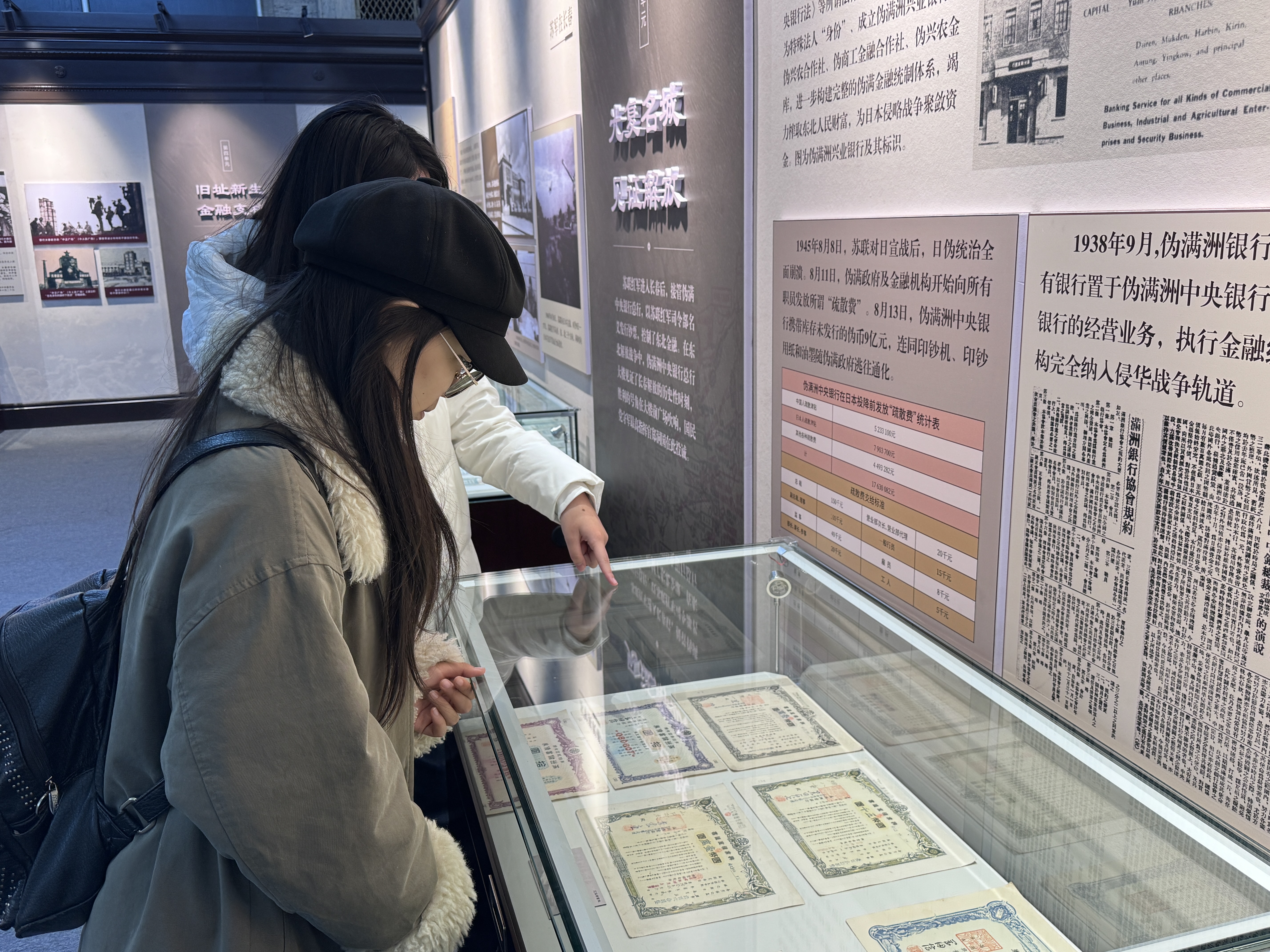 工作人员为大家讲述了这座银行旧址历经伪满时期、解放战争时期的风雨历程。同学们认真聆听,不时驻足凝视,通过一件件历史实物、一幅幅珍贵图片和详实的文字资料,系统了解了伪满洲国中央银行的设立背景、职能运作及其作为经济掠夺工具的本质,对“金融是国家重要的核心竞争力”、“金融制度是经济社会发展中重要的基础性制度”等论断有了更为直观和深刻的历史认知。