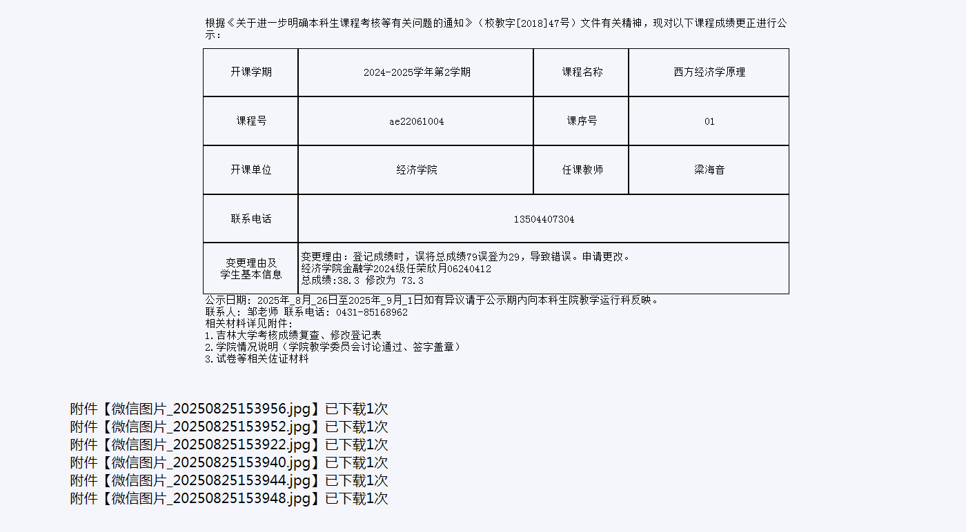 关于44118太阳成城集团2024级任荣欣月同学西方经济学原理课程成绩更正的公示