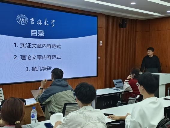 分享会开篇,齐建鑫学长结合自身参与科研项目、撰写学术论文的经历,分享了从科研入门到逐步进阶的心路历程,以“过来人”视角为学弟学妹们化解科研初期的迷茫。随后,他围绕 “实证论文写作范式”“理论论文(DSGE方向)写作范式” 两大核心板块,系统拆解两类经济学论文的结构框架,让抽象的写作方法具象化。