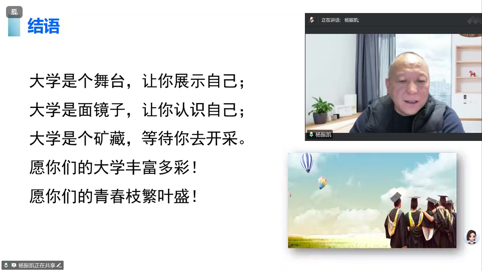 10月17日,2024级财政1班在班主任杨振凯老师主持下,于线上召开了“视野扩展与方向选择”主题班会。杨老师围绕大学生成长困惑与发展方向,为全班同学作了一场兼具思想深度与温度的专题分享。