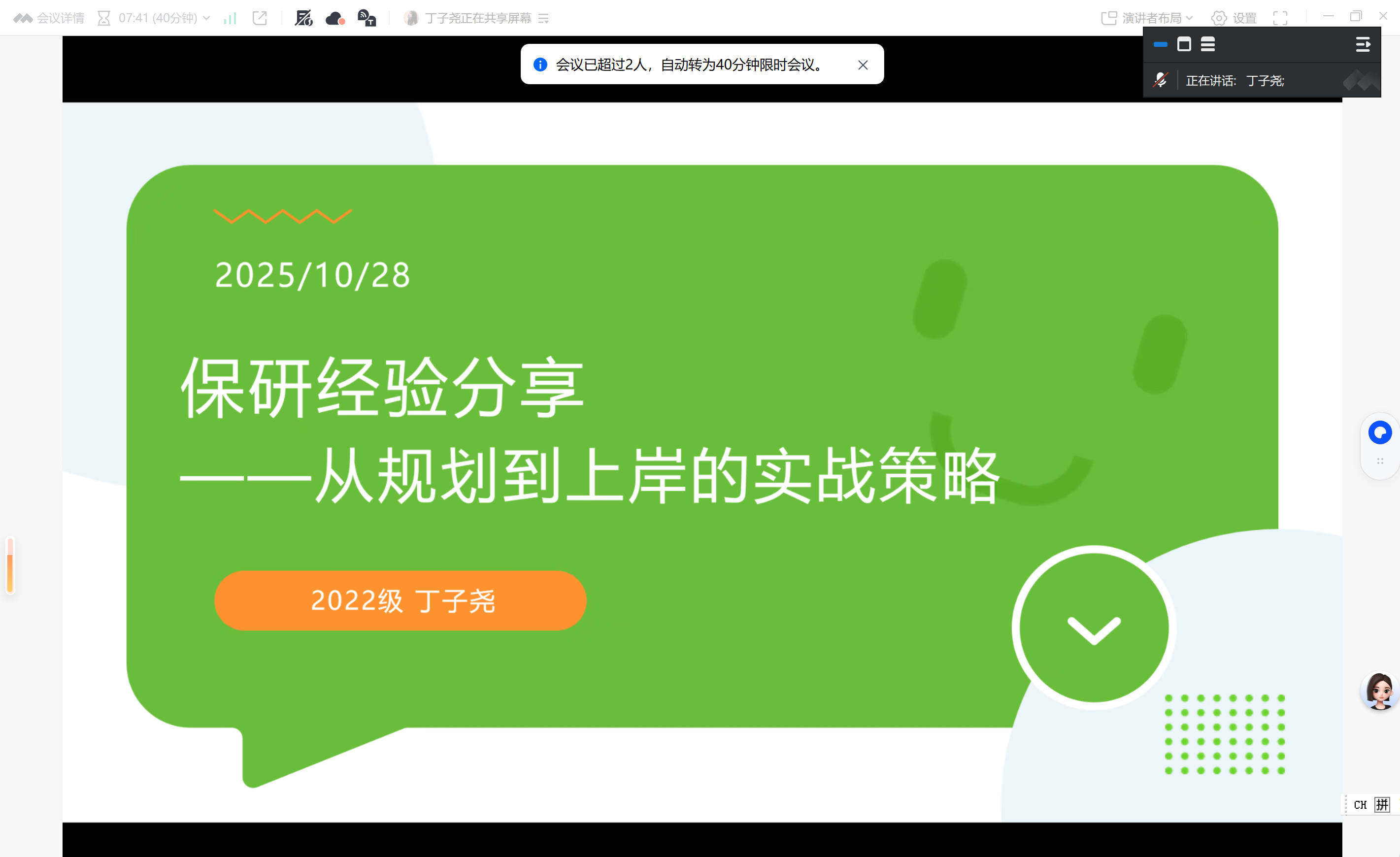 交流会首先由丁子尧学姐明确了申请策略的选择。提醒同学们“海投”简历能避免错过机会并提供面试练习,但其时间成本高昂;“精准投递”节省大量时间以专注于自我提升但易错过潜在机会。成功的关键在于将个人兴趣、专业背景、自身优势与目标院校的项目需求、历年录取数据进行深度匹配,并合理参考他人成功案例,做出最明智的选择。其次她强调了专业课与英语的重要性,坚实的学业基础是获得保研资格的前提。英语能力,尤其是口语,在面试中至关重要。学姐建议建议通过每日练习、模拟面试等方式增强表达力与自信心,并系统积累专业词汇,为应对英文提问打下坚实基础。