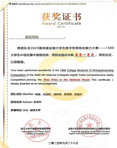 2025年9月28日,第四届全国大学生数字贸易综合能力大赛总决赛在浙江大学圆满落幕。史本叶教授所指导的研究生队伍历经初赛、区域赛的层层严苛选拔,在长达五个月的刻苦备战与激烈角逐后,最终在全国总决赛的舞台上凭借卓越表现,荣获“2025第四届全国大学生数字贸易综合能力大赛——数字贸易大数据分析赛道”全国一等奖,同时获得“1688AI创业金星”称号,史本叶教授也再次荣获“优秀指导教师奖”